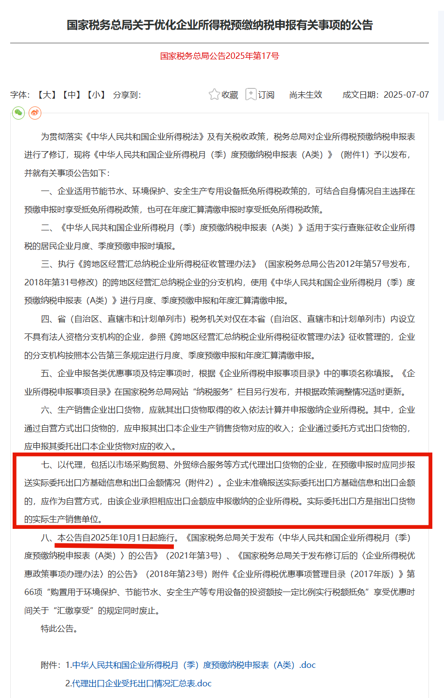 國家稅務總局發布公告,《國家稅務總局關于優化企業所得稅預繳納稅申報有關事項的公告》簡稱17號公告,2025年10月1號起實施。對企業所得稅預繳納稅申報表進行了修訂。