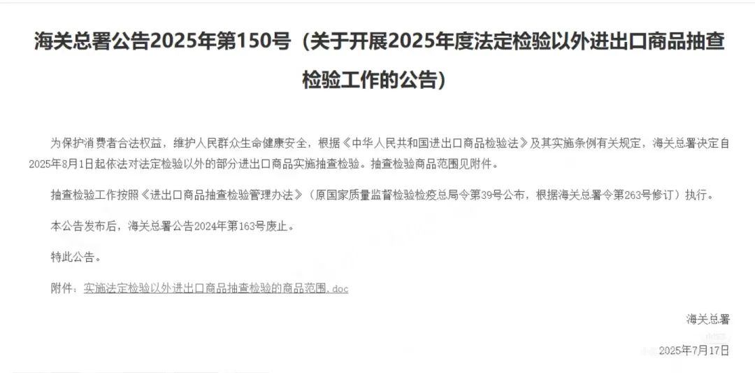 執(zhí)行時間:2025年8月1日開始,替代 2024年第163 號公告